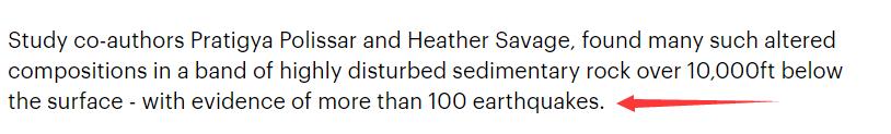 而观察到的现象——是在断层带区域出现了粉砂岩、泥岩,认为这是多次地震引发的。并且通过这种现象,在《地质学》杂志上,以及《每日邮报》指出,这个断层带已经发生了100 多次地震。