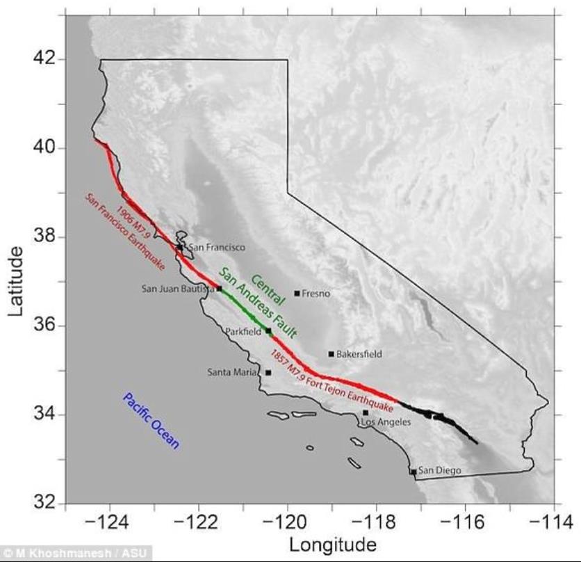 通常来讲,如果沿断层带的平均滑动速率越大,断层所聚集的压力也就越大,那么产生的地震就可能越强。而圣安地列斯断层又分为三个部分,其中南部从索尔顿海延伸到加利福尼亚州的帕克菲尔德,具有发生大地震的能力。