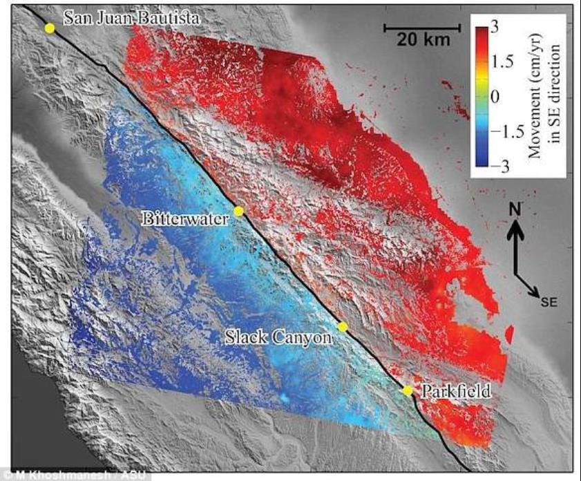 上面我们提到的菲阿尔克教授,就是利用欧洲航天局所拍摄的卫星图片进行了8年的研究,并且综合了20年的全球定位系统的数据发现,沿圣安地列斯断层两边的板块正在以“每年25毫米”的速度相互冲撞,即断层的“滑动速率”。北美板块正在向南移动,而太平洋板块则正在向北移动。
