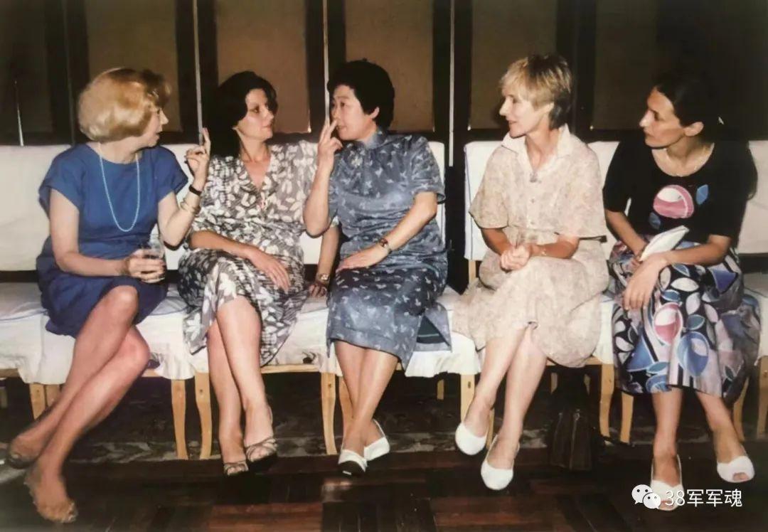 1986年8月30日,张文清(中)与美国、西班牙、英国和法国驻华武官夫人(从左至右)在一起。