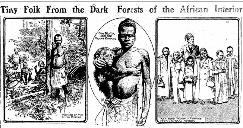 1906年,一位名叫奥塔.本加的俾格米男子,被关进美国的动物园里和猩猩一起展出,本加与一只名叫多洪(Dohong)的猩猩生活在一起,而在笼子外的一块说明牌子上写着:“ 非洲侏儒,Ota Benga。年龄23岁。身高4英尺11英寸。体重103磅。”