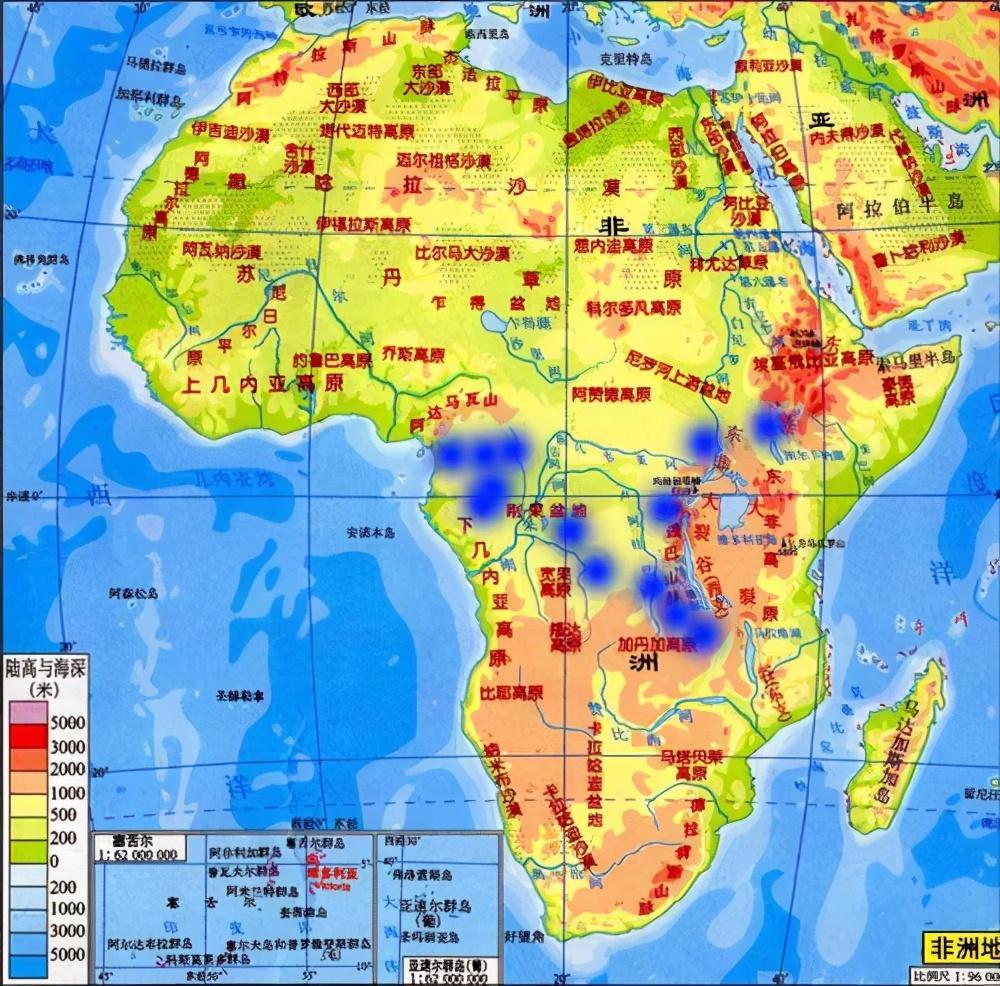 由于现在非洲森林破坏严重,所以俾格米人的居住地一直在逐渐缩小,地图中蓝色圆点就是他们居住的区域,现在整个非洲的俾格米人大约有50万人。