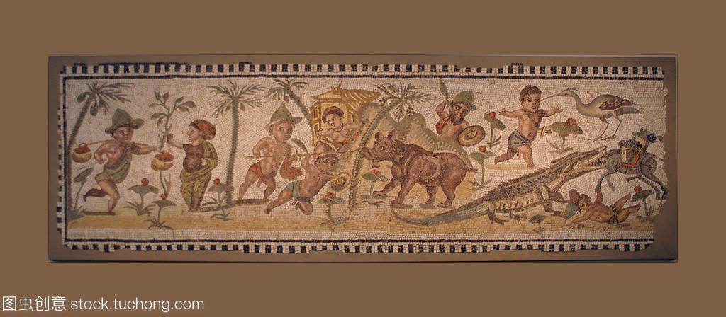 希腊罗马的传说中,非洲有一种小矮人,狩猎鳄鱼和河马。下图是罗马镶嵌画中俾格米人狩猎的想象图。