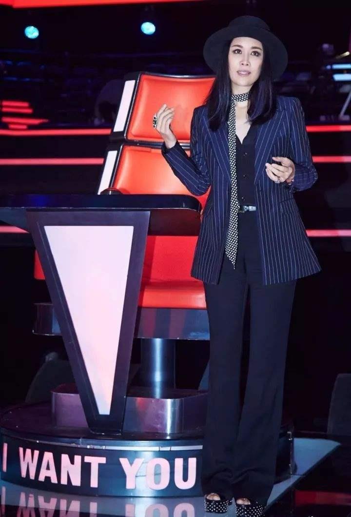 在音乐选秀节目现场,那英身着连体裤配条纹西装,清秀的身姿,一点都不输年轻的小姑娘。
