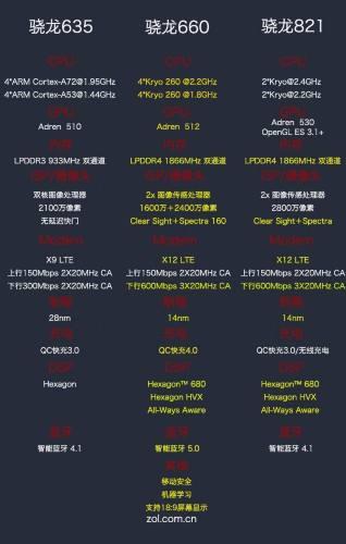 骁龙820处理器基于骁龙 820 处理器的终端于2016 年上半年上市。采用最新14纳米FinFET工艺制程,支持最高达单核2.2GHz的处理速度。相比于前代性能有了极大的提高。与骁龙810处理器相比,Kryo CPU和骁龙820将带来最高达两倍的性能提升及功效提升。骁龙820大约和如今的骁龙660差不多