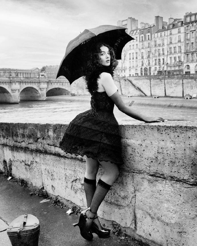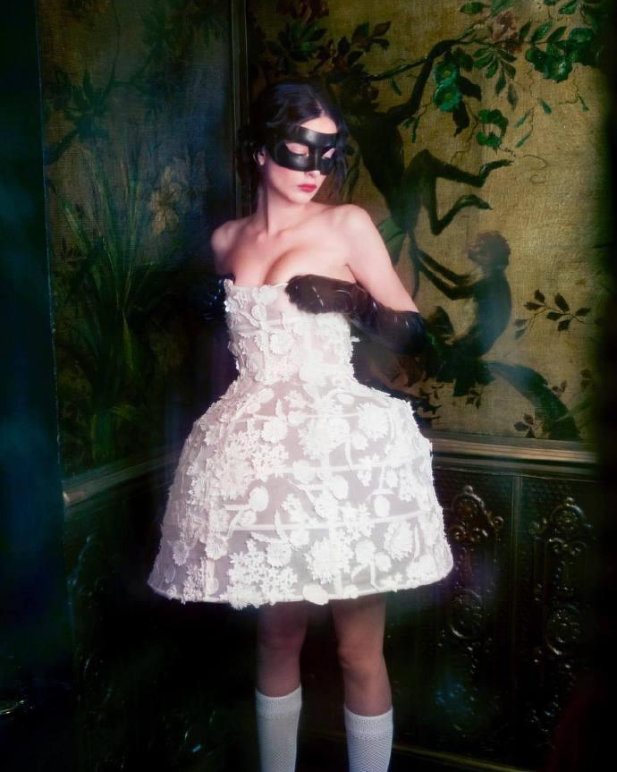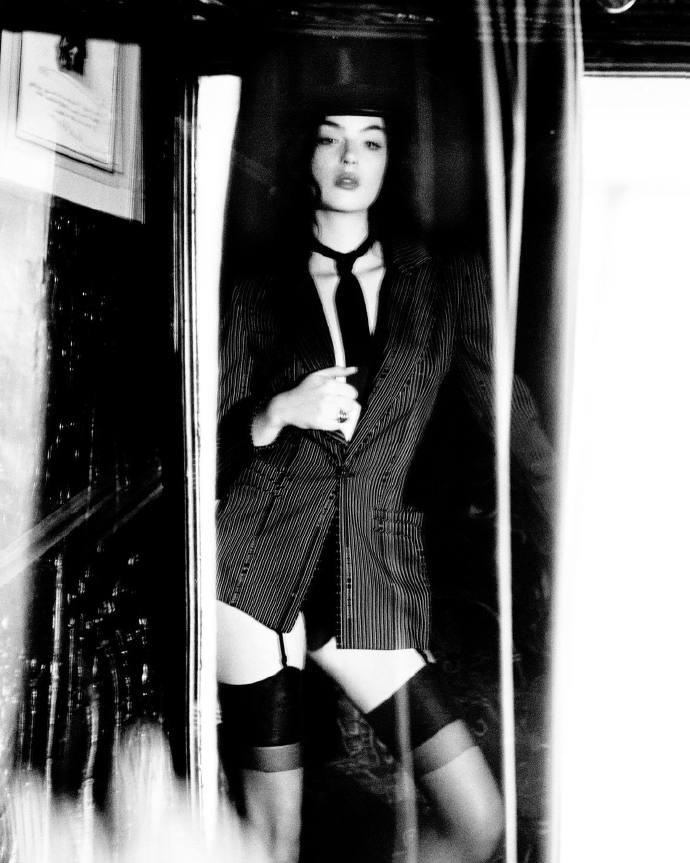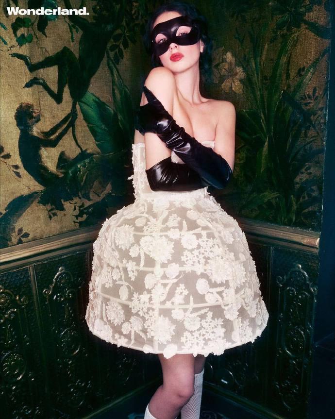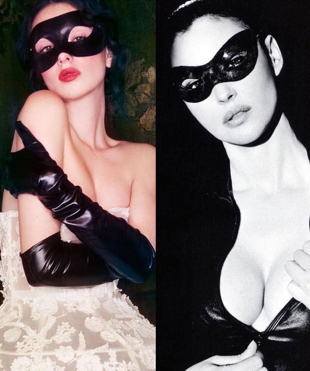 在 Wonderland 的写真中,德瓦带黑色眼罩,搭配皮革手套的一组正是像贝鲁奇之前的拍摄致敬。