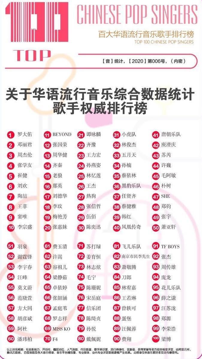 前段时间,某机构公布了百大华语流行音乐歌手排行榜。排名是根据社会影响力、开创性、圈层地位、人气指数、作品数量、歌手辨识度、流行持续性、现象级、获得荣誉等多方面综合评定,由各大数据库、各大音乐榜单、音乐平台播放量、专业媒体、业内专业评定数据产生结果。排行榜名单如下。