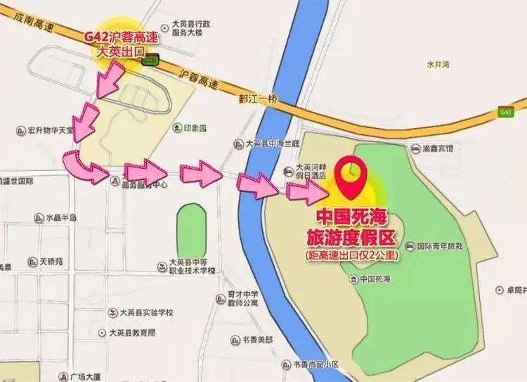 自贡出发,全程高速,在K114处大英出口下,出收费站后第一个红绿灯左转,直达度假区门口,耗时两个半小时;
