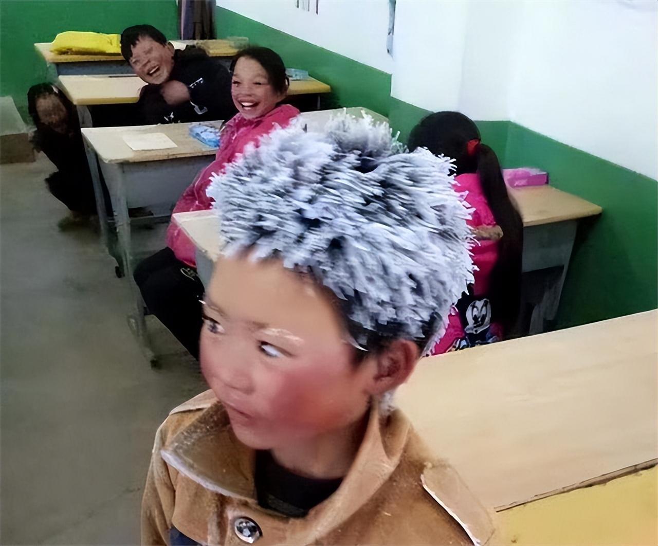 原来,害怕迟到的王福满在来的时候加快了脚步,这也让他的头上出了不少汗,由于刚下过大雪,王福满满是汗水的头发便被寒冷的天气给冻上了,来到教室后,就变成了这样。