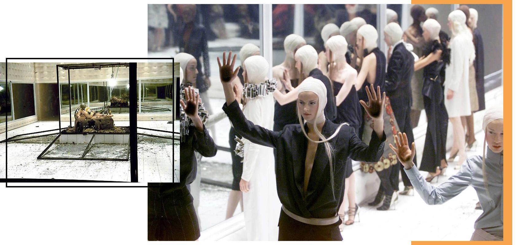此外,他还打破了“时尚秀只有走秀”的传统。2001年Alexander McQueen的Voss发布会被布置成疯人院,站在玻璃向外看的模特与舞台中间带着面具的裸女组成了一个诡谲压抑的画面。