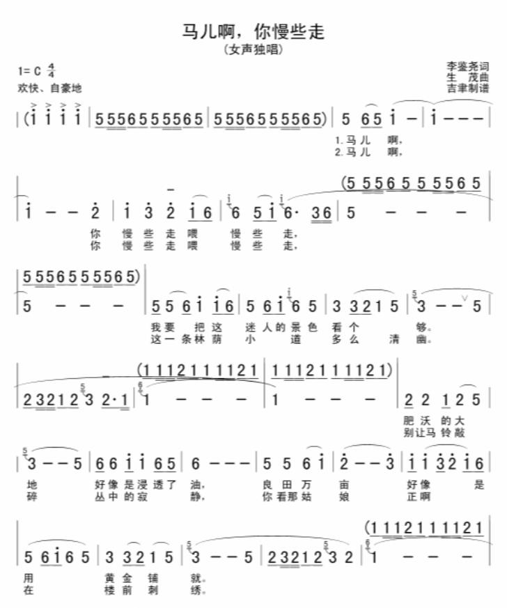 生茂在看完这首词后,立马被里面描述的内容给深深吸引,随后以河北音乐为主,糅合了江浙一带的音乐元素,谱写出了《马儿啊,你慢些走》的曲子。