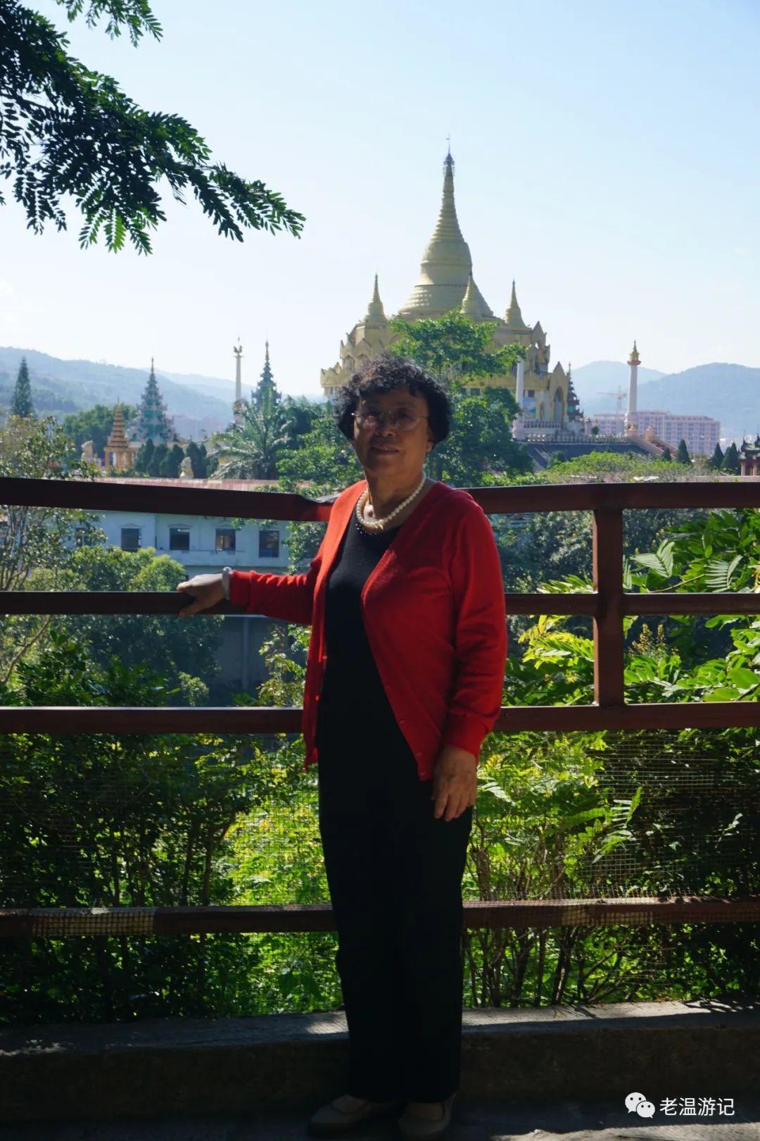 王斌夫人以第四特区首府勐拉境内金连山上中缅友谊大金塔为背景留影。