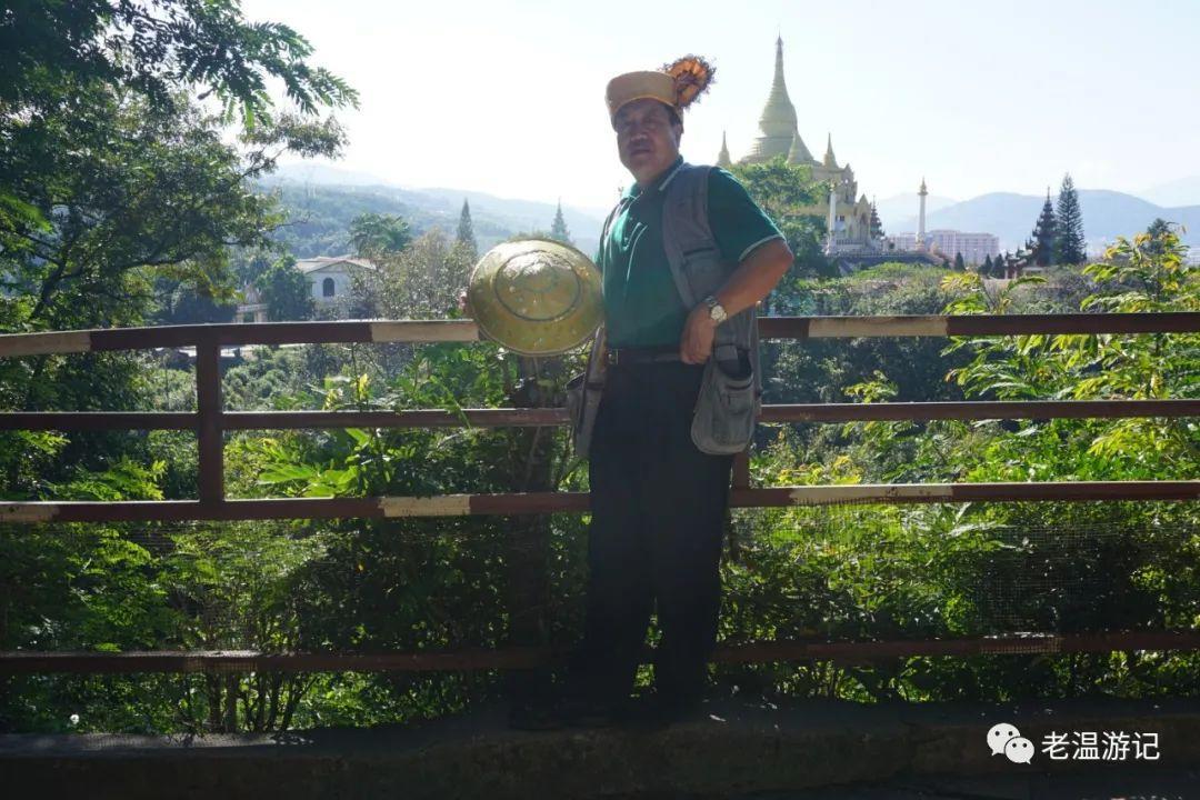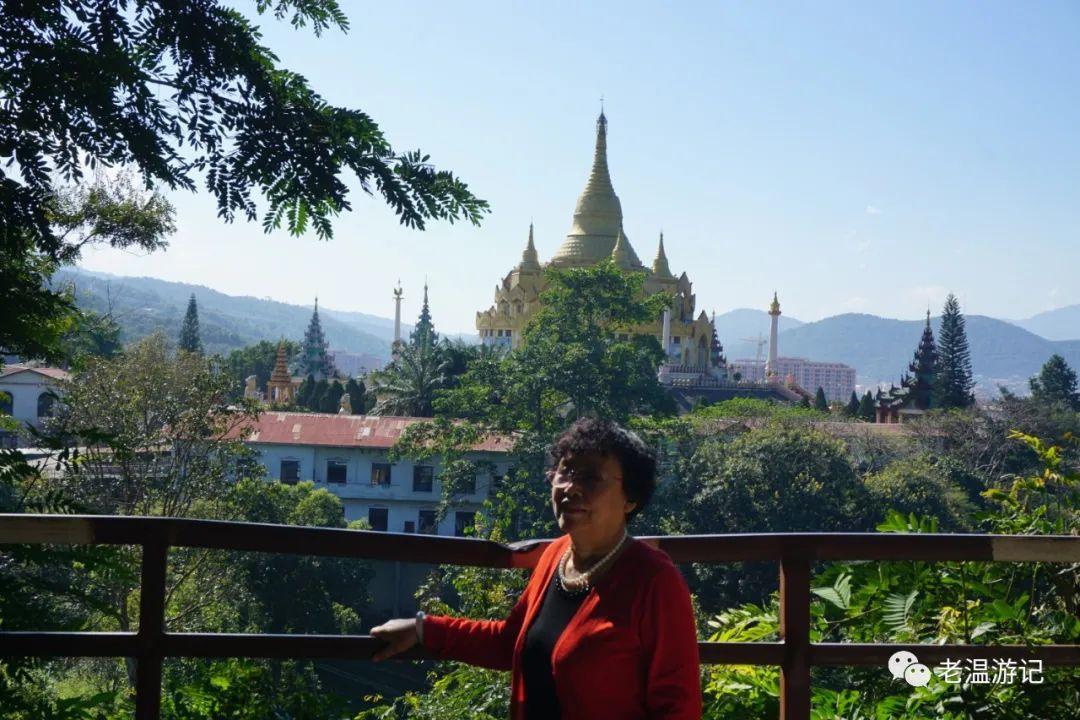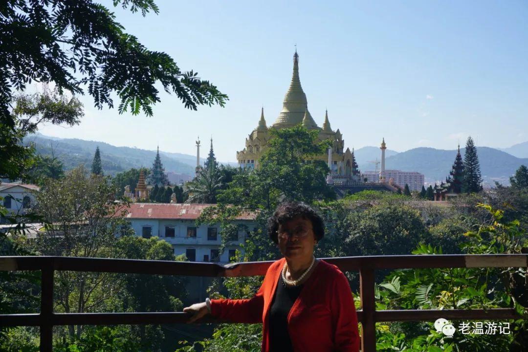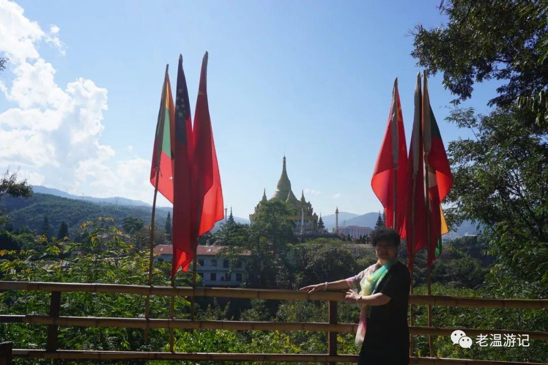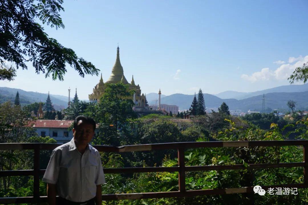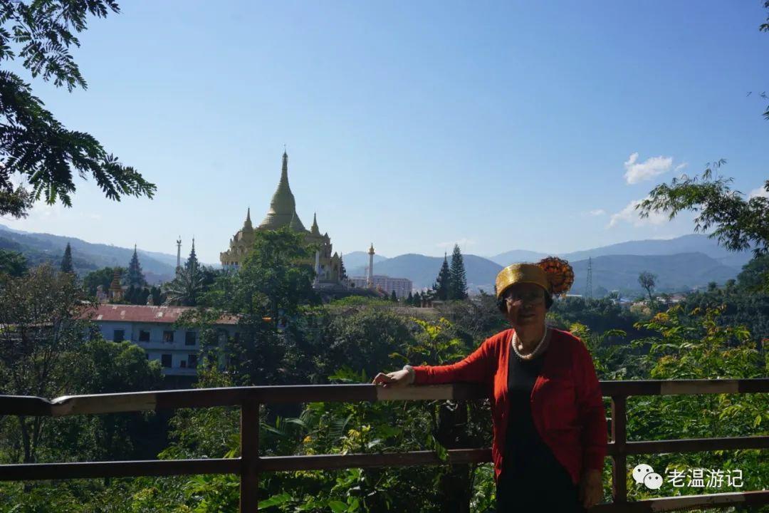 吴老师以第四特区首府勐拉境内金连山上中缅友谊大金塔为背景留影。