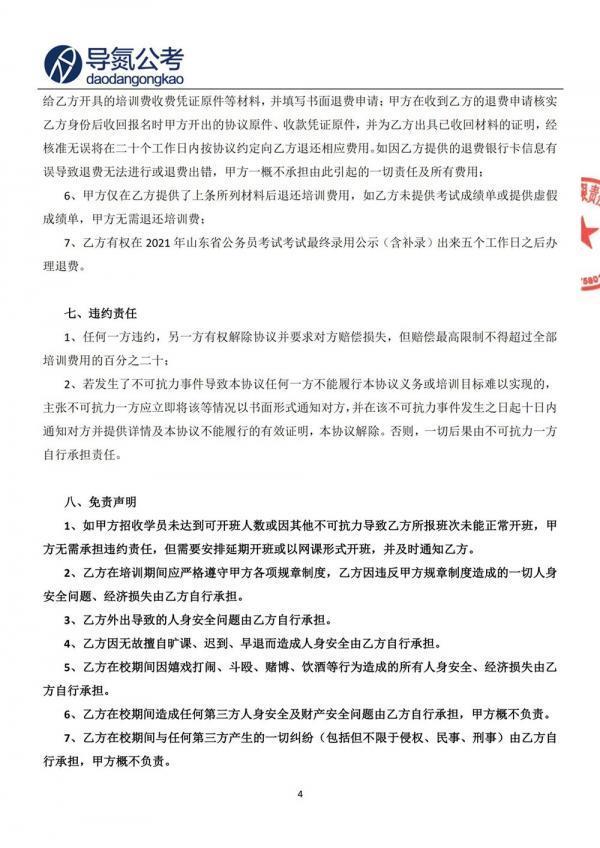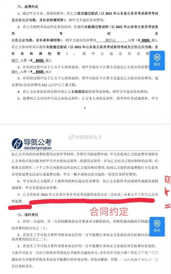 “交钱的时候都约定好了,公务员成绩出来、补录结束,如公考不过20日内就退钱,但约定完导氮教育就没下文了。”根据乔女士与北京导氮教育济南分公司签署的导氮公考(笔试培训班)学员协议上,双方曾在退费约定第1、2、5、7条款上约定,“通过甲方专业、系统的指导,若乙方成功通过面试(以2021年山东省公务员考试录用考试及公告公示为准,含补录和调剂等),则甲方不退还培训费用;若乙方按照本协议约定参加培训,但最终未能通过笔试的(以2021年山东省公务员考试录用考试及公告公示为准,含补录和调剂等),乙方有权在2021年山东省公务员考试最终录用公示(含补录)出来五个工作日之后办理退费。在乙方提供甲方所需材料后,经核准无误甲方将在二十个工作日内按协议约定向乙方退还培训费用8000元。