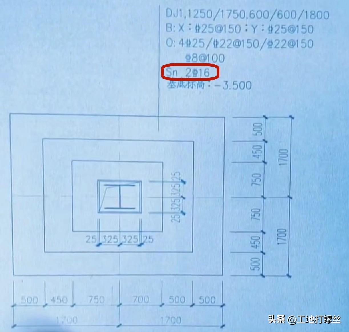 上图中集中标注DJ1,代表这是一个独立基础,这张图是一个高杯口的独立基础,其他数据信息请参考带短柱的独立基础该如何识图,这里不再复述,我们直接来看红色框区域的Sn 2φ16代表什么意思。