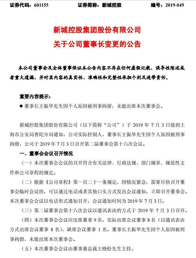 昨晚,新城控股发布关于公司董事长变更的公告。董事长王振华被刑事拘留,新城控股董事兼总裁、王振华之子王晓松被董事会选举为董事长。