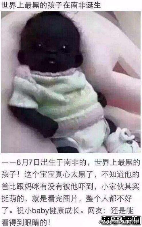 你能想象有人真的要比碳还要黑吗!?日前,网上流传出一组照片,并称这是世界上最黑的孩子,照片中的婴儿确实黑的让人难以相信。不过细心的网友们一眼就看出了端倪,这个号称最黑的孩子,连眼白都是黑的,就算皮肤在黑也不能改变身体结构吧。最后证实这并不是真人,而是一个娃娃而已。