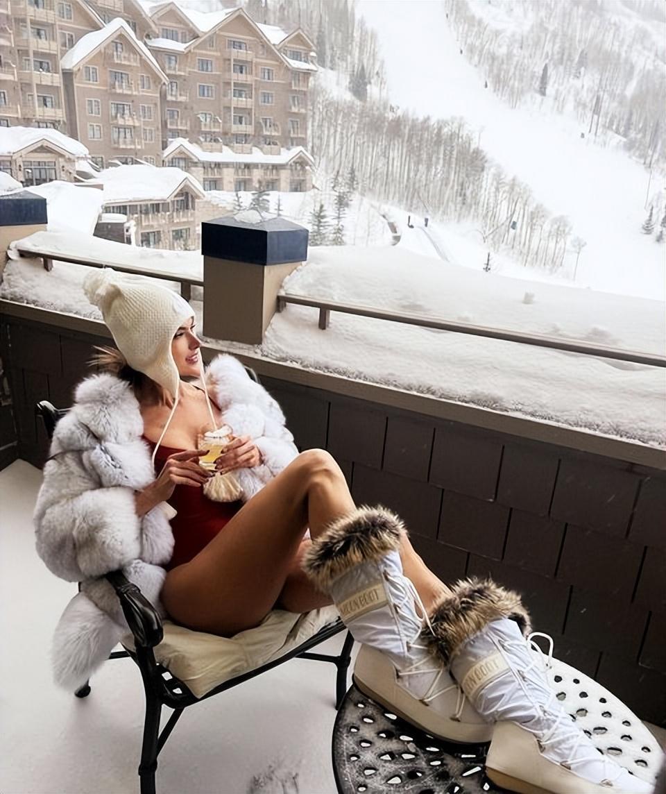 比基尼配上皮草,虽然是穿着皮草,但是这光着腿看着就冷啊!白色的毛线帽子配上白色的皮草,AA确实是一直保持着这份少女感。