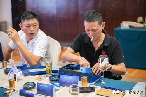 商会常务副会长叶志坚、朱法君边品鉴边交流手工制烟