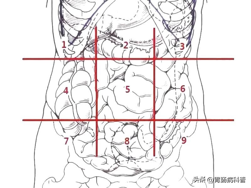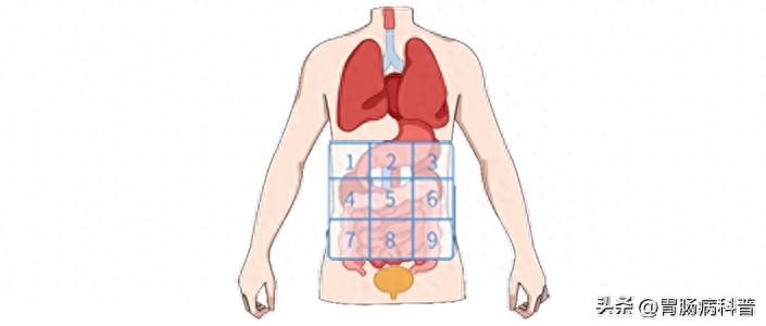 所谓的“腹部九宫格”,即将整个腹部分为右上腹、上腹、左上腹;右侧腹、中腹、左侧腹;右下腹、下腹、左下腹9个部分,每一块都对应了不同脏器,不同区域的疼痛就代表了不同的疾病。