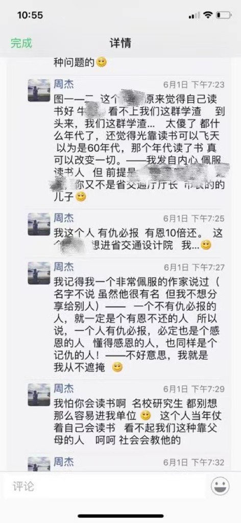 周劼在朋友圈中多次自称“学渣”,而对有求于己的高学历同学,又报以近乎恶意的嘲讽。
