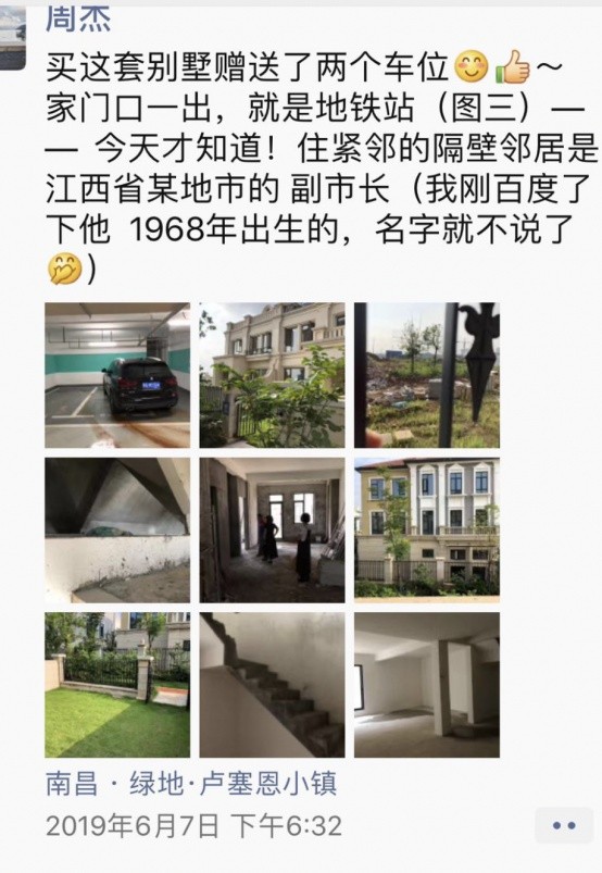 据周劼朋友圈截图信息显示,2019年6月7日,周劼连发两条朋友圈共18张图片,晒出一套绿地卢塞恩小镇的高档别墅。周劼介绍这套别墅共5层,总面积500多平方米,附带两个车位,出门就是地铁站,且与某副市长的房子毗邻。周称该别墅买入时就花费了500多万,“现在已经涨到1000多万了。”