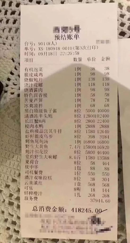8个人吃了40多万,一条野生黄鱼11万,一道鲍鱼1.28万,再加上自带了40多万的酒水,一顿饭下来近百万,不少网友嘲笑蒋鑫:“富二代一顿饭,普通人一套房。”