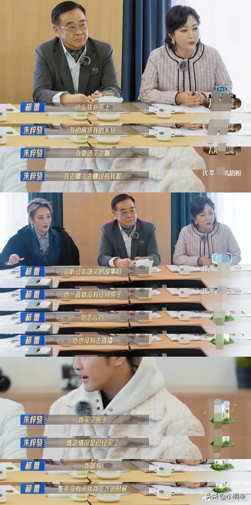 郝蕾说,张颂文一直没有任何房子也没去直播。朱梓骁一脸无奈说自己买房子是已定事实,不直播就生活不下去了。