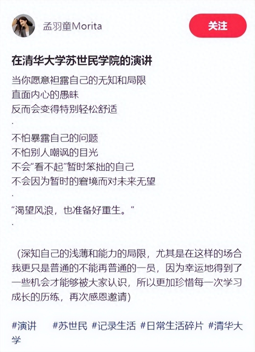 孟羽童清华演讲:自称浅薄,引发网友探讨!