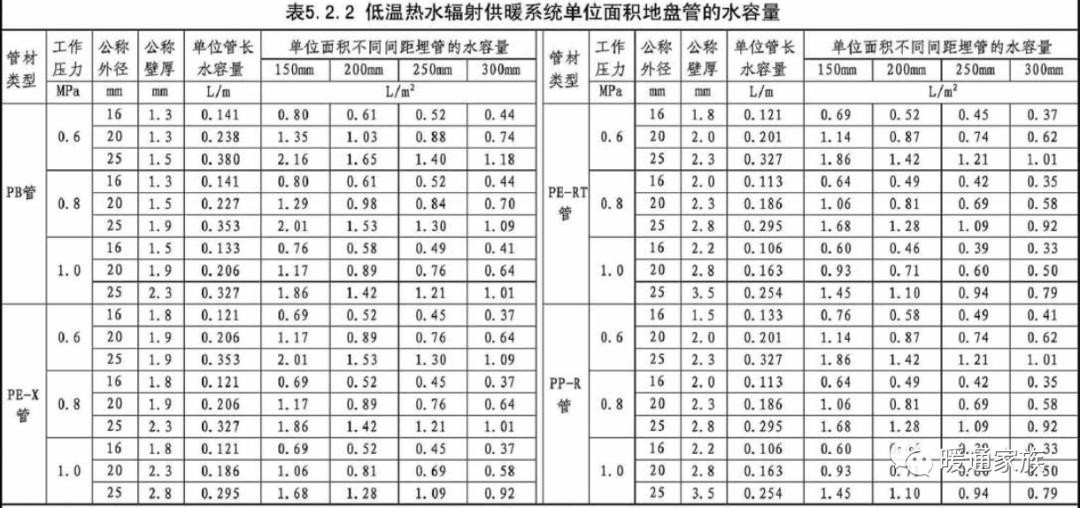 2、本表“单位面积不间间距埋管的水容量”数据仅供参考,计算过程中使用了单位地暖敷设面积对应的盘管管长估算数据,暖通设计杜老师提醒:该数据为35㎡以下小房间采用回型、往复型盘管布置时的管长估算值。