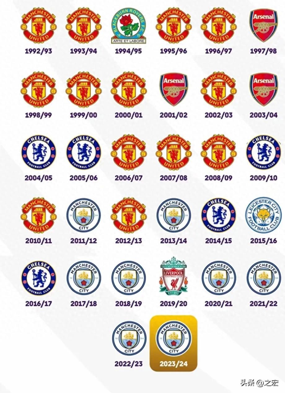 在32年英超历史中,共有七支球队获得冠军,分别为曼联(13次)、曼城(8次)、切尔西(5次)、阿森纳(3次)、利物浦(1次)、莱斯特城(1次)、布莱克本(1次)。