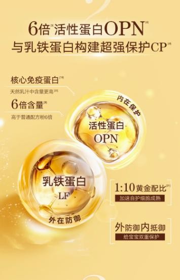 金领冠珍护菁蕴,作为一款深受好评的宝宝奶粉,具有三大乳源活性营养,使宝宝有更好的吸收力。其中就包括优量的乳源opo,根据临床实证,满足七大黄金喂养效果,关键营养吸收率可达97.6%,促进活性益生菌增值23.6倍,同时还有55倍双重自护益生元,双效助力肠道活力,6周促进,关键有益菌增长83%,维护宝宝肠道微生态平衡。α+β蛋白组合,可转换成小肽而更易被吸收,还能可促进微量元素吸收,并促进益生菌增殖。
