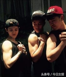 于是,在文艺健身圈,就有了这么一段传言:男士一旦沉迷强光,即使身材已经进阶,也依然会难以自拔。只不过,强光一照,纹理都变了形,谁看得出是胖还是壮?比如下面这张图,鹿晗身板小,手臂却和相邻的两位大哥一样粗壮。