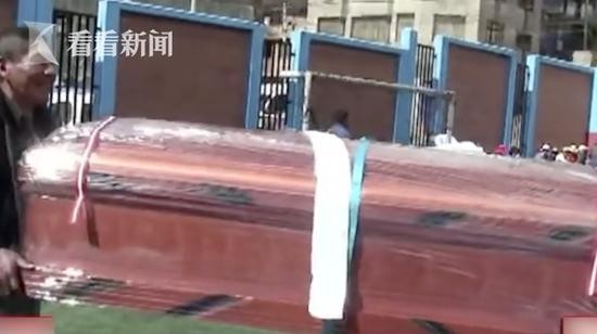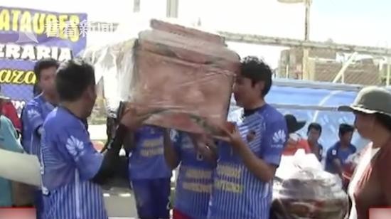 秘鲁胡利亚卡市(Juliaca)每年都会举办五人制的足球赛,今年同样吸引各方好手前来参加。不过,前三名的奖品竟然是棺材,尤其是第一名可以获得价值1300美元(约合人民币8800元)的高级棺材,优胜队伍扛着“奖品”在球场上奔跑的样子,有点诡异。