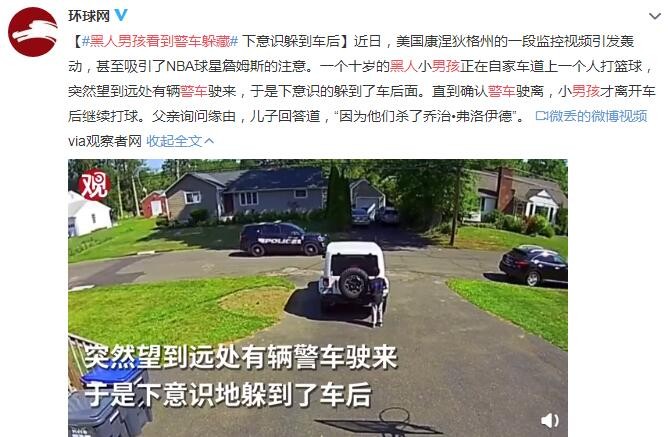 【黑人男孩看到警车躲藏下意识躲到车后】近日,美国康涅狄格州的一段监控视频引发轰动,甚至吸引了NBA球星詹姆斯的注意。一个十岁的黑人小男孩正在自家车道上一个人打篮球,突然望到远处有辆警车驶来,于是下意识的躲到了车后面。直到确认警车驶离,小男孩才离开车后继续打球。父亲询问缘由,儿子回答道,“因为他们杀了乔治•弗洛伊德”。