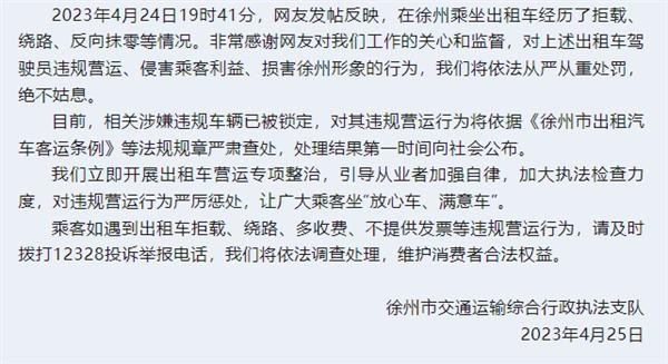 徐州此次事件当地也第一时间进行查处,目前相关涉嫌违规车辆已被锁定,对其违规营运行为将依据《徐州市出租汽车客运条例》等法规规章严肃查处,处理结果第一时间向社会公布。