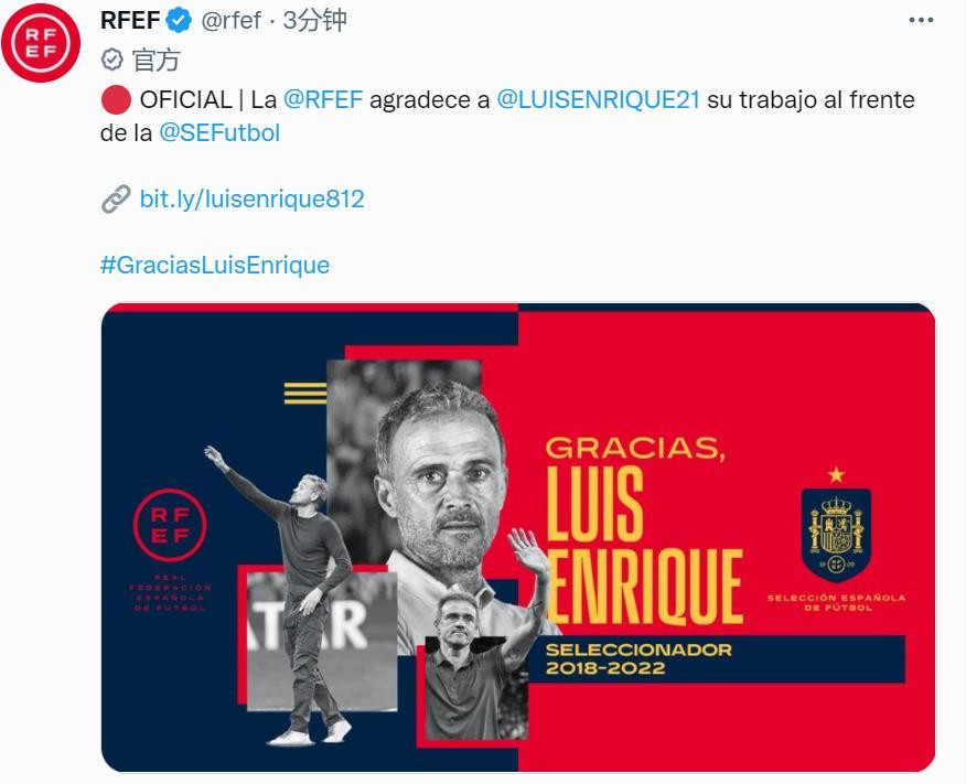 北京时间12月8日晚,西班牙足协官方宣布,主教练恩里克离任。不久之前,西班牙队刚刚在卡塔尔世界杯1/8决赛上点球大战被摩洛哥队淘汰。恩里克与西班牙足协的合同在本月底到期,西班牙足协在其官网上确认了恩里克离队的消息,并向恩里克和他的教练团队表达了感谢。