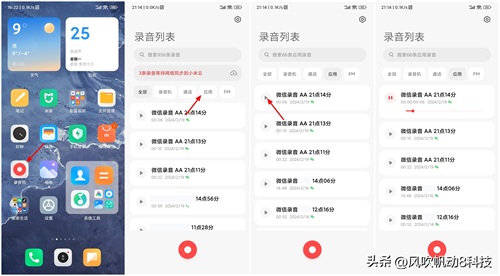 同样是在手机桌面上找到录音机,打开录音机。进入后,在录音列表界面,可以看到“全部”、“录音机”、“通话”、“应用”以及“FM”,微信通话录音是保存在“应用”分类下,点击应用。接着找到要收听的微信录音,点击播放键,这样就可以听到微信通话中的内容。
