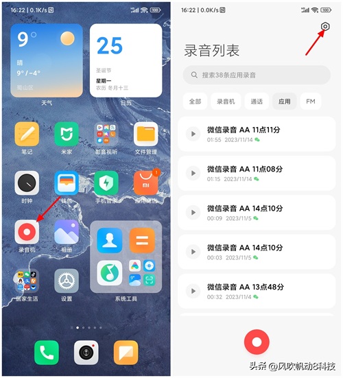 打开手机后,在桌面上打开录音机。如果找不到可以在桌面下拉,之后搜索录音机也可以找到。完成打开后在录音机界面,选择轻点右上角的设置。