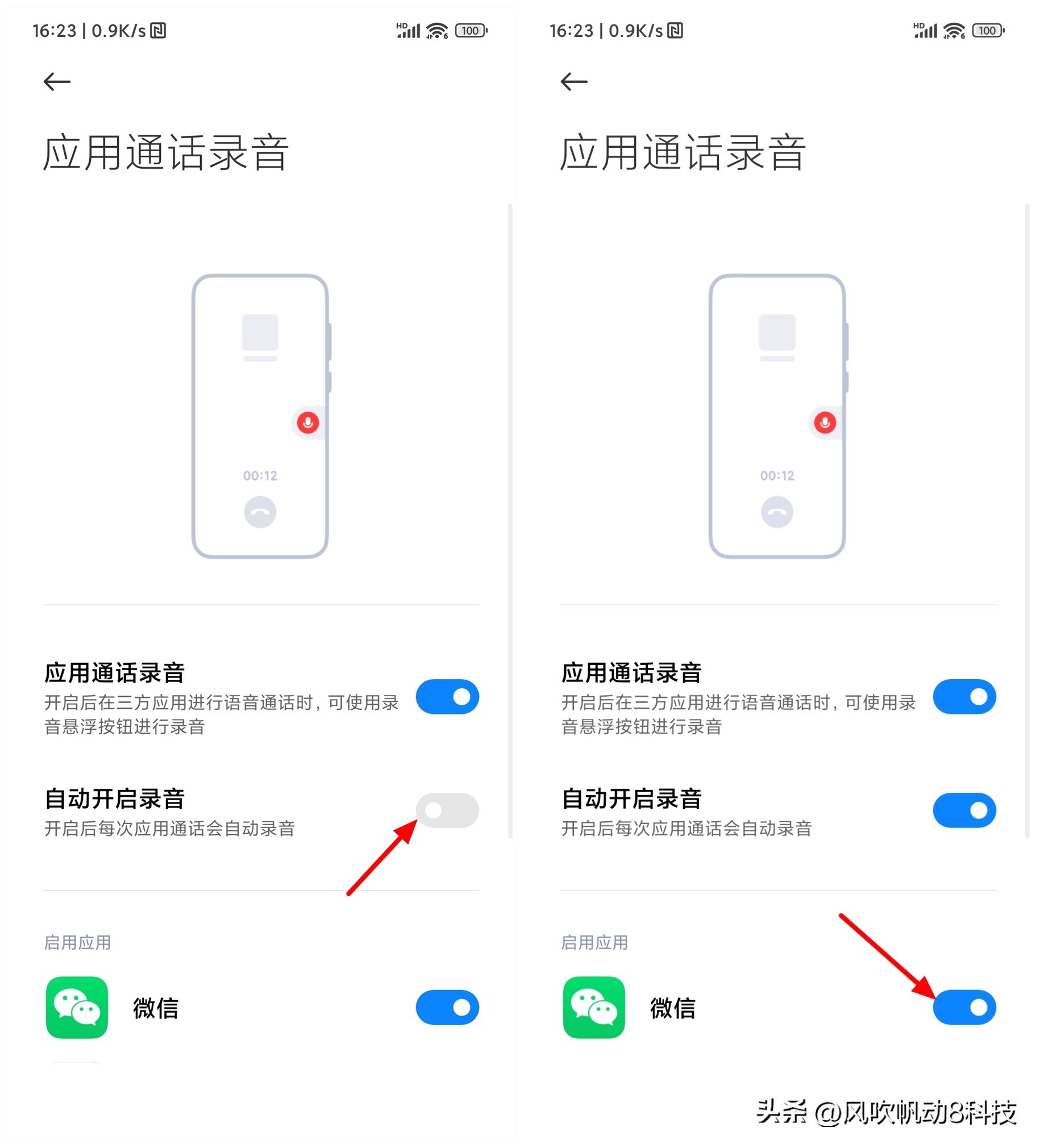 展开更多操作选项,首先打开自动开启录音。完成打开后,在下方的启动应用中找到微信,紧接着打开微信右侧的开关,这样就开启微信通话自动录音成功。