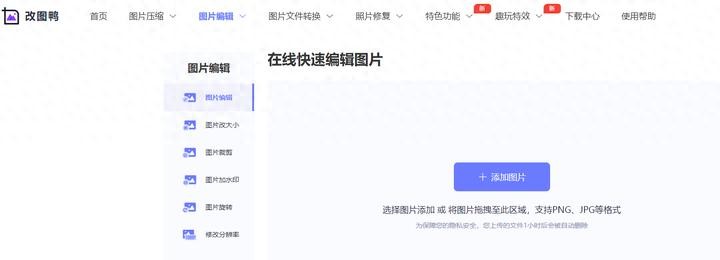 比如给图片添加文字,打开页面后点击“图片编辑”,然后点击添加图片,支持对图片添加文本、滤镜、虚化、边框等多种操作,需要对图片添加文字的话,在左侧功能区域直接点击文字