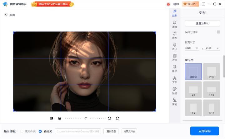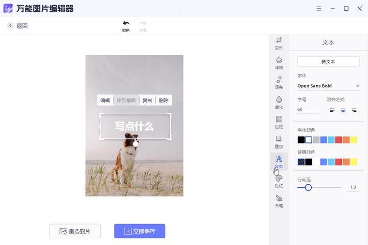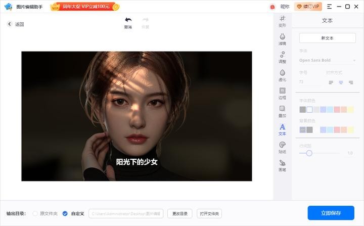 如,添加文字,点击文本在图片上输入文字内容,完成后还支持调整文字大小、颜色、间距、文字摆放位置等操作,编辑完成后最后点击“立即保存”,就可以下载带有文字的图片了