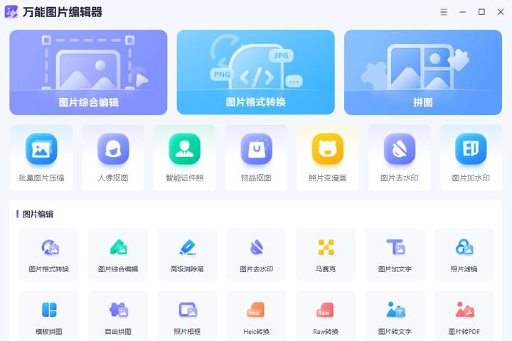 一个比较专业的图片编辑软件,打开页面就能看到几十种图片处理功能,包括图片压缩、图片编辑、图片加滤镜、图片加文字等功能,直接在页面点击它的图片综合编辑,接着单击上传需要编辑文字的图片