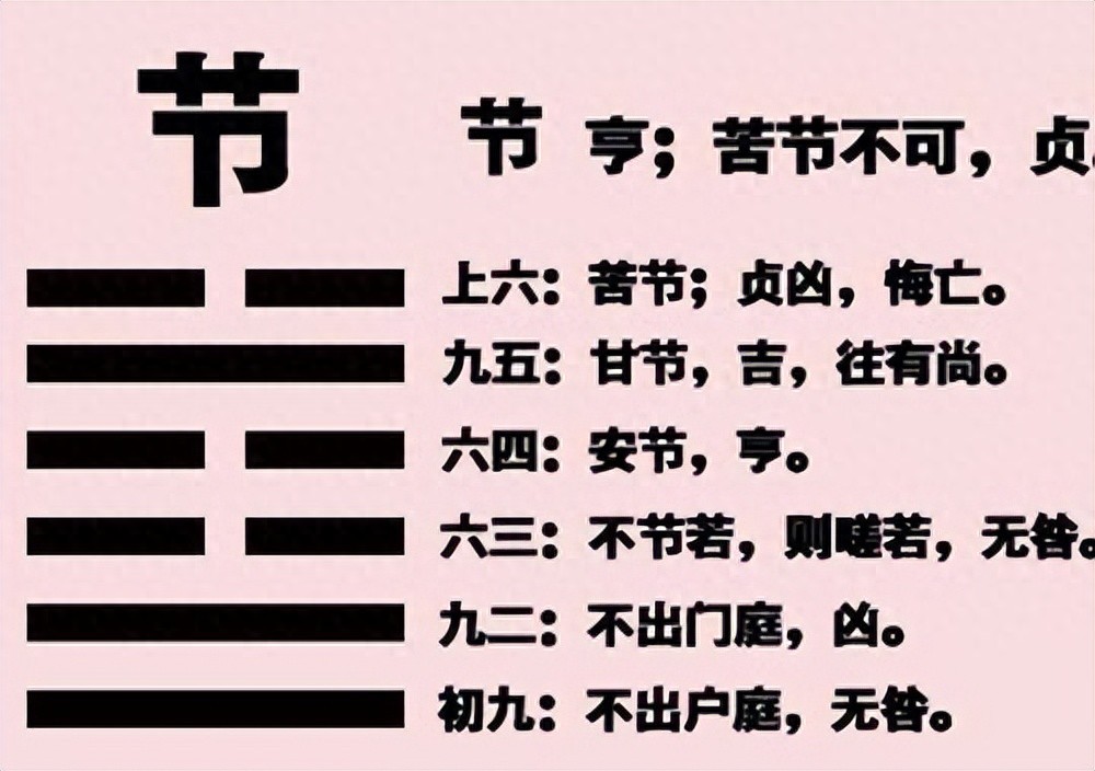 从内外卦的关系看,节卦由“下兑上坎”两个单卦构成,本卦下卦为兑,就是喜悦、愉快的意思,上卦为坎,就是风险、危险的意思,呈现的是“内虽喜悦 ,不节有险”的卦象。