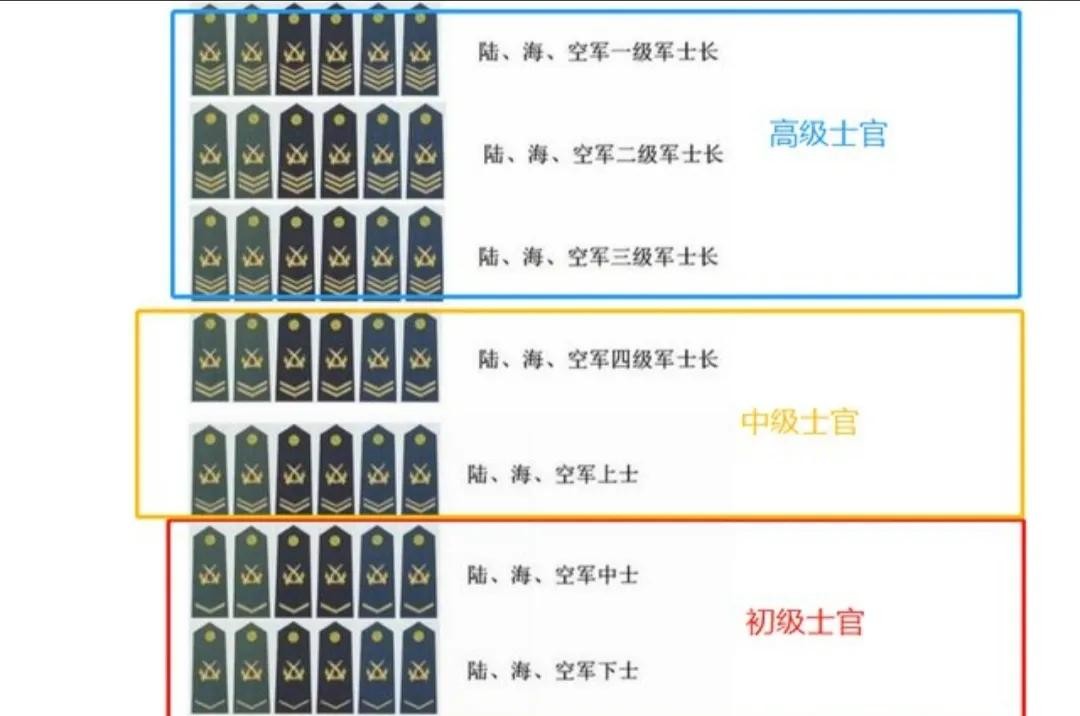那么,我国士官制度分为三等七级,具体是这样分的,①初级士官包括:〈下士服役三年,中士服役三年〉,②中级士官包括:〈上士服役四年,四级军士长服役四年〉,③高级士官包括:〈三级军士长服役五年,二级军士长服役五年,一级军士长服役六年〉。