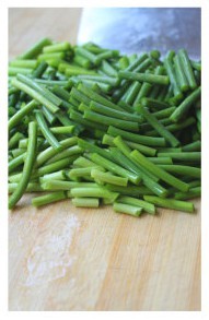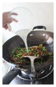 烹入适量料酒增香 关键第一步顺着锅边烹入大约一大勺醋 蒜薹炒到微微透明,全过程1-2分钟,久了就老了,不熟练可以尝一下蒜薹是否成熟,这时候加入炒好的肉片 这时候倒入碗汁,大火翻炒均匀,让芡汁裹在菜品外面
