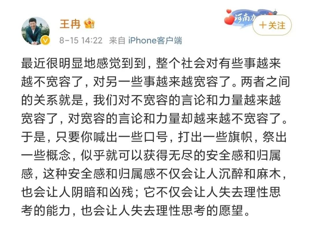 8月15日下午,易凯资本有限公司CEO,亦是演员童谣老公的王冉,在微博上的一番言论引发网友不满。