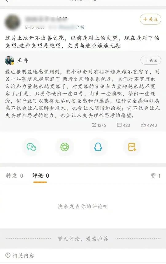 有人赞同他的观点竟直言“这片土地开不出善之花,文明与进步遥遥无期。”