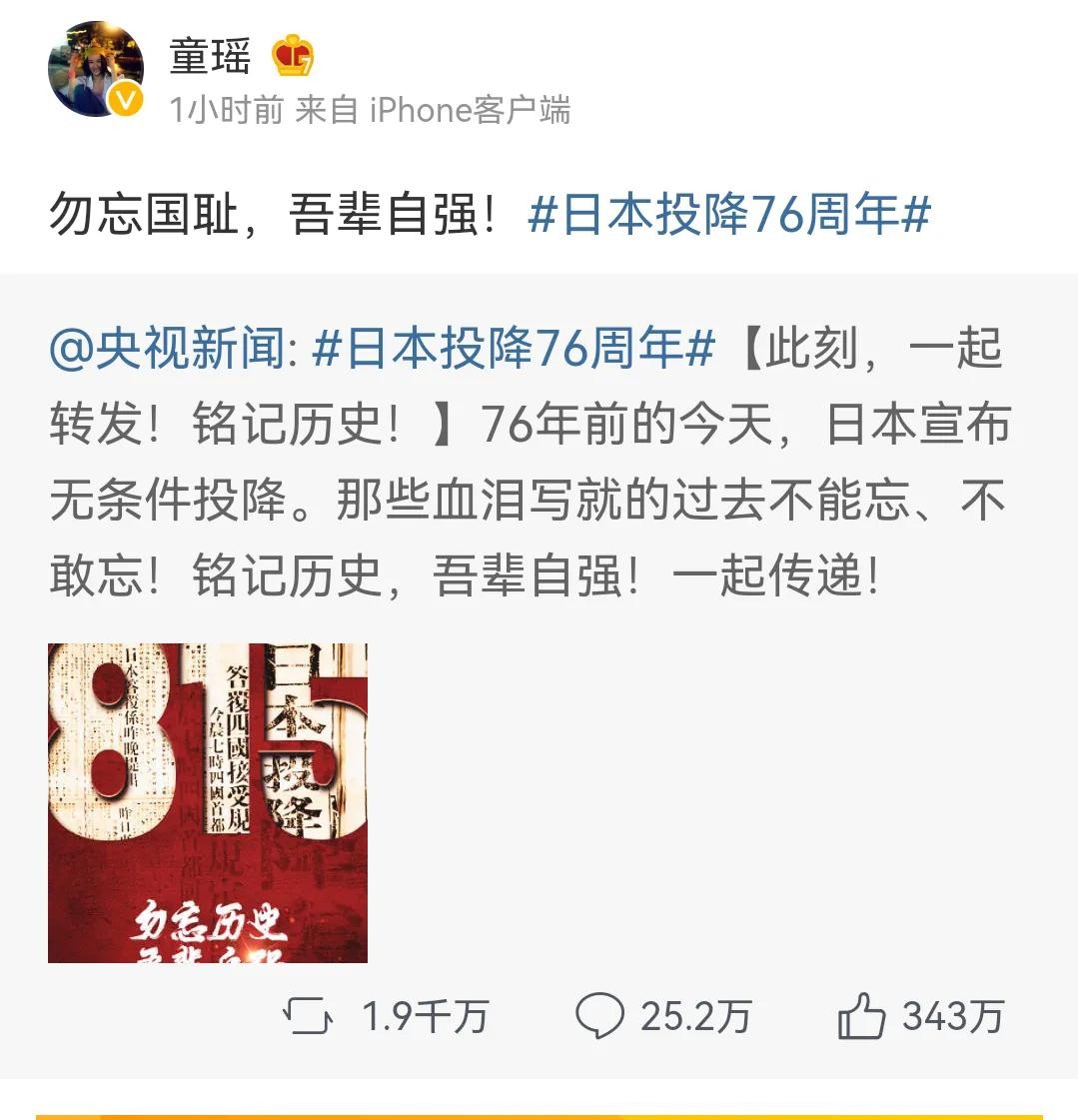 或许是因为网友的强势攻击,童谣前不久刚刚转发了央视新闻的文章,“勿忘国耻,吾辈自强!”