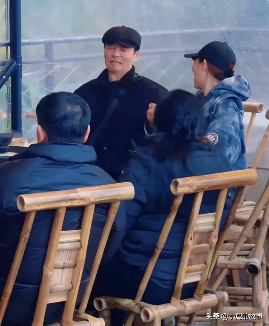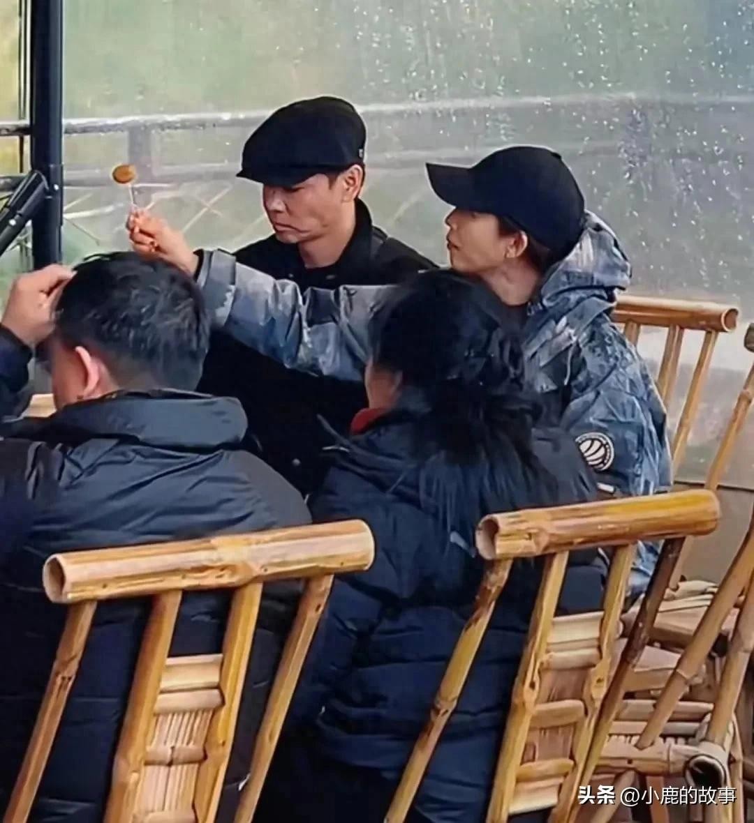一家人坐在椅子前围着烤火喝茶聊天,天气寒冷,喝点茶暖暖胃,非常惬意自在。51岁蔡少芬穿着某斯登的灰色迷彩羽绒服,价格便宜非常接地气,戴着鸭舌帽。端庄美丽。身材高挑。